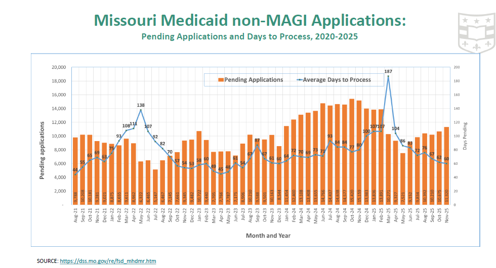 The delays in processing non-MAGI applications continues to improve since February 2025 as the number of days pending dropped from 107 in February 2025 to 60 in November 2025, though the two months to process applications is still lengthy. It is also the case that the number of non-MAGI pending applications has risen considerably since May 2025 (see graph); it is unclear why this is happening.