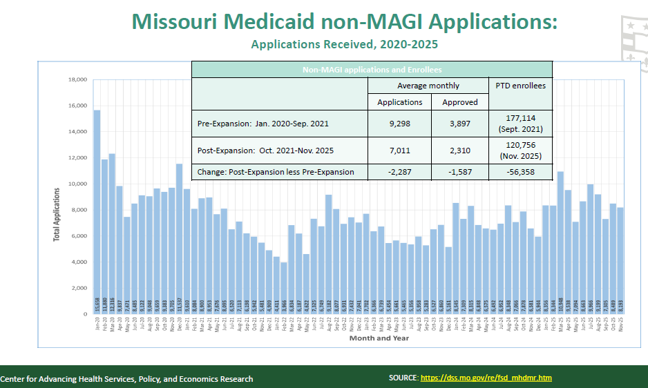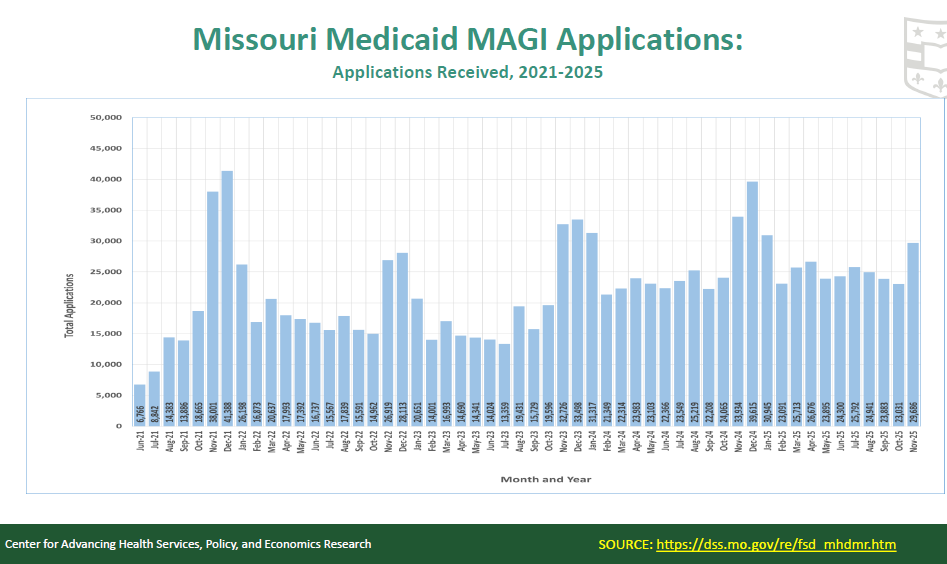 The state of Missouri has released their first report on Medicaid applications and enrollment for November 2025. The number of applications to Medicaid rose from 23,031 to 29,686 (up 29%) from October to November 2025; however, that level of applications is 13% below the number of applications received in November 2024 (33,934). It is too early to tell what this drop indicates; but it is worth watching the whole open enrollment period.
